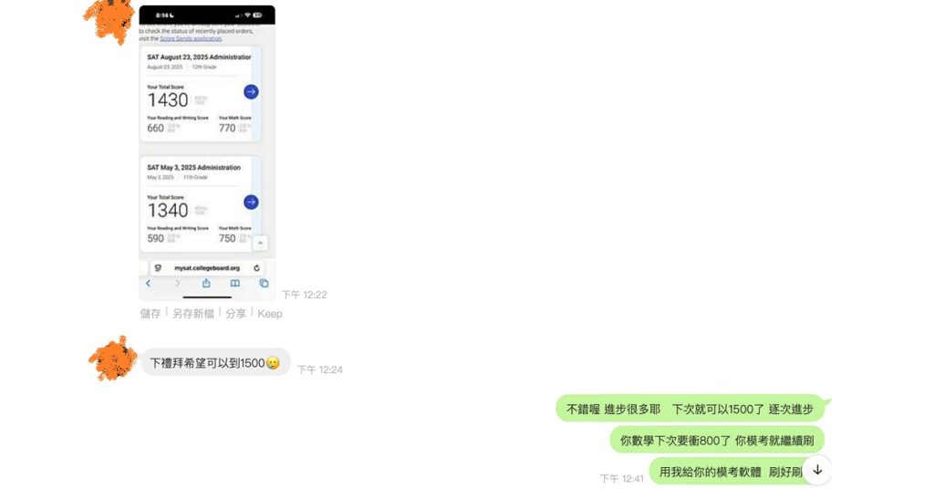 這次他的SAT數學已經考出770分,他跟我說下一次考試要挑戰800分滿分。